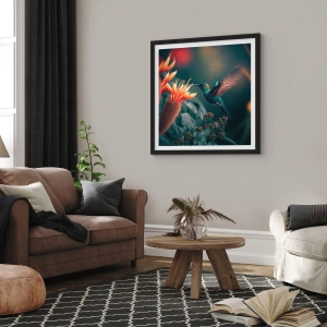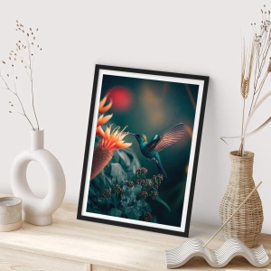 Poster in einem schwarzem Rahmen - Ein bunter Kolibri neben Blumen vor einem natürlichen Hintergrund - 100x70cm - Wirklich buntes Leben - Moderne Wanddekoration für Wohnzimmer und Schlafzimmer ARTTOR