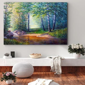 Bild auf Leinwand - Leinwandbild - Ein Waldbach, umgeben von Birken und Sonnenschein - 120x80cm - Idyllische Landschaft - Moderne Wanddekoration für Wohnzimmer und Schlafzimmer ARTTOR
