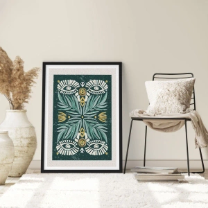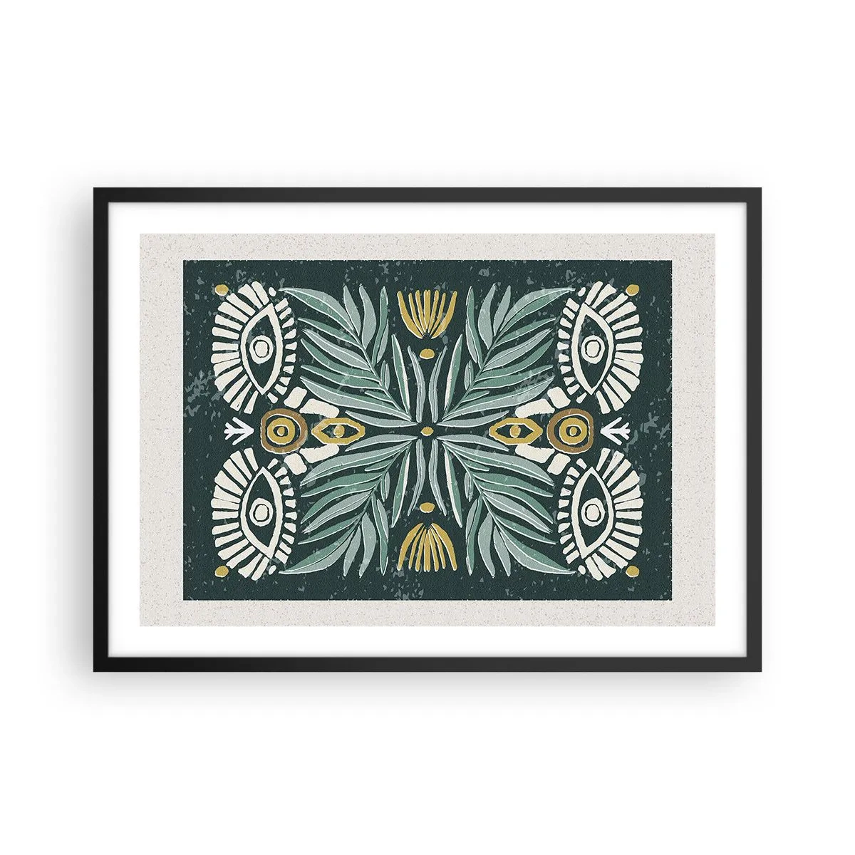 Poster in einem schwarzem Rahmen - Symmetrisches Pflanzenmuster auf grünem Hintergrund - 70x50cm - Wie ein Volksausschnitt - Moderne Wanddekoration für Wohnzimmer und Schlafzimmer ARTTOR