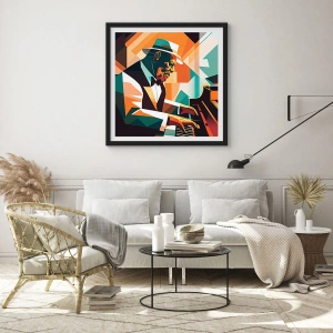 Poster in einem schwarzem Rahmen - Abstrakter Musiker, der in warmen Farben Klavier spielt. - 100x70cm - Alles vom Jazz - Moderne Wanddekoration für Wohnzimmer und Schlafzimmer ARTTOR