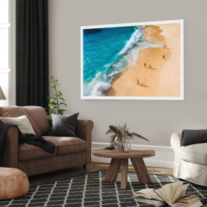 • Das Poster zeigt einen goldenen Strand, umspült von türkisfarbenen Wellen. Mehrere Menschen schlendern am Ufer entlang und genießen die Sommersonne und die Ruhe der Küstenlandschaft.
