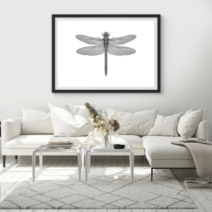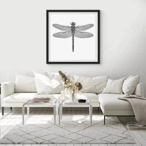 Poster in einem schwarzem Rahmen - Schwarz-weiße Zeichnung einer Libelle auf weißem Hintergrund im minimalistischen Stil - 70x50cm - Präzision der Natur - Moderne Wanddekoration für Wohnzimmer und Schlafzimmer ARTTOR