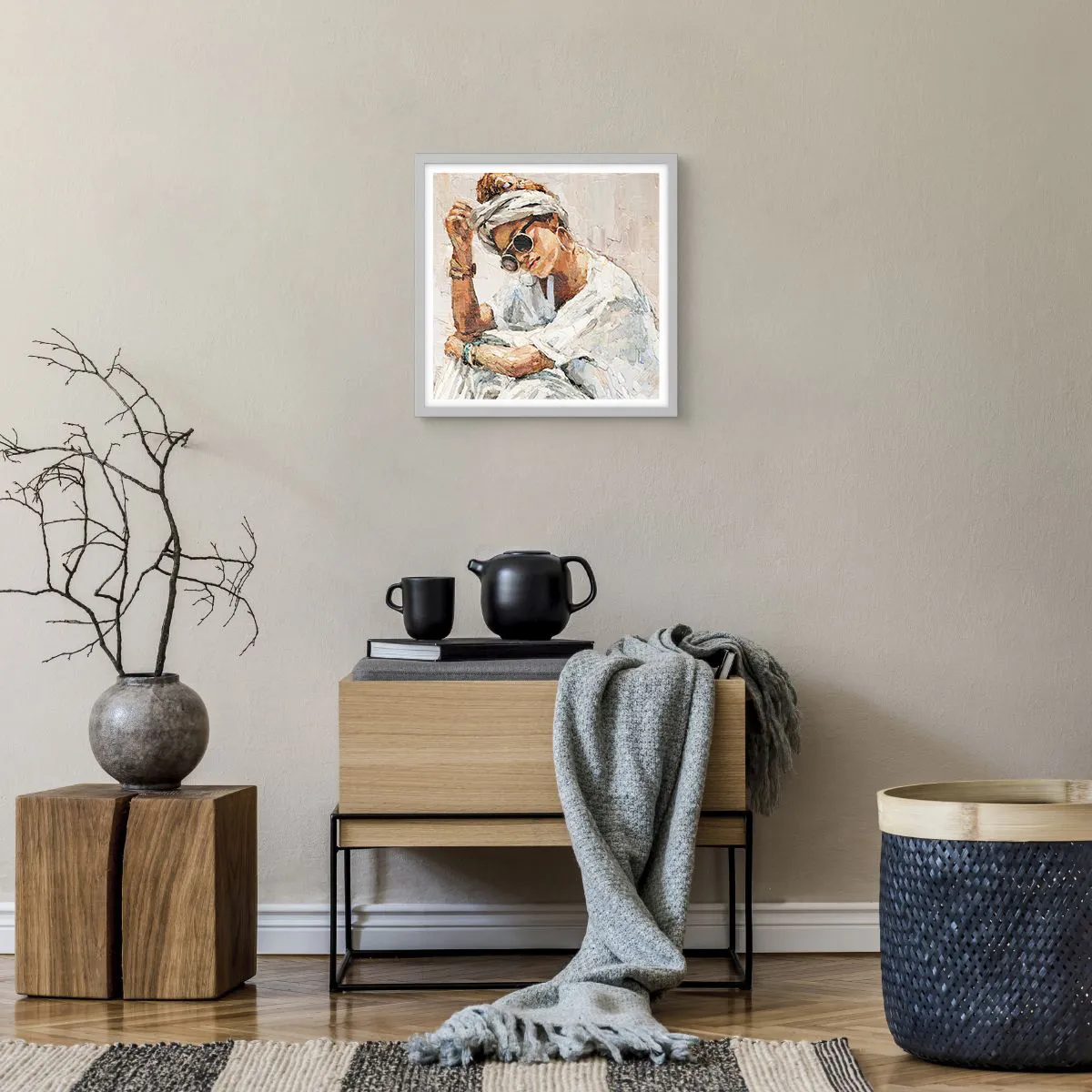 • Porträt, Boho, Öl, Menschen, Mode, Pastell, Kunst, Für das Esszimmer, für den Flur, für das Wohnzimmer, für das Schlafzimmer, Weiss-braun, Quadrat