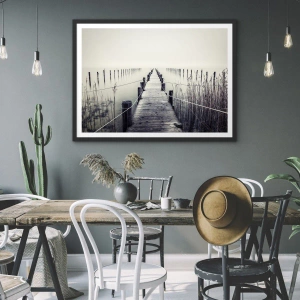 Poster in einem schwarzem Rahmen - Eine Holzbrücke, die in einen nebligen Raum führt - 70x50cm - Tauchen Sie in Ruhe ein - Moderne Wanddekoration für Wohnzimmer und Schlafzimmer ARTTOR