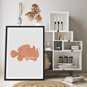 - Das Poster zeigt die detailreiche Illustration eines Tiefseefisches in rostfarbener Farbe, die mit präzisen Linien vor hellem Hintergrund dargestellt ist. Der minimalistische Stil und die Liebe zum Detail verleihen ihm eine elegante, moderne Ausstrahlung.