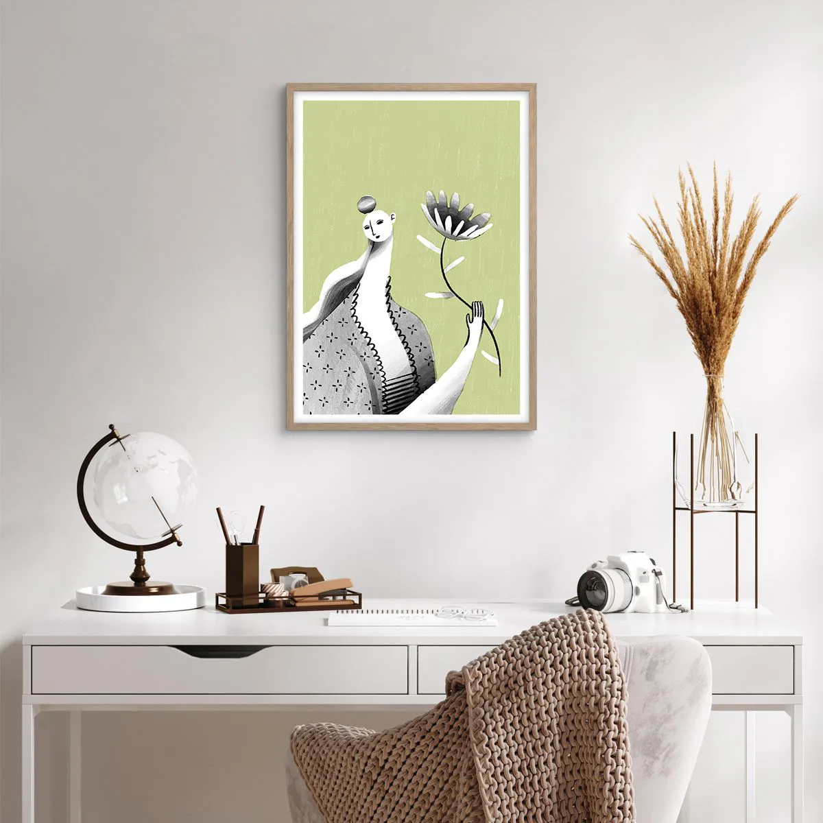 Poster in einem Rahmen aus heller Eiche - Modernistisches Porträt – eine Blume haltend - 50x70 cm