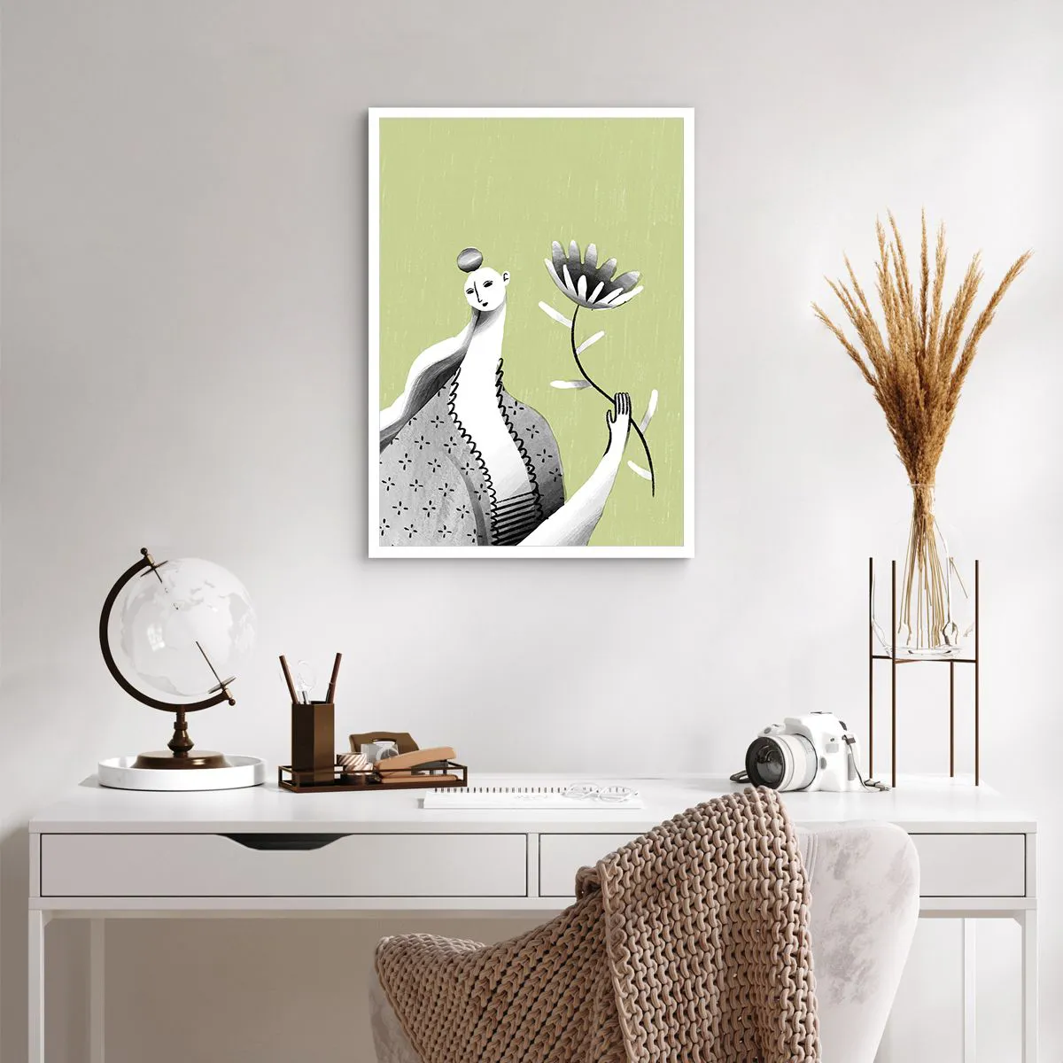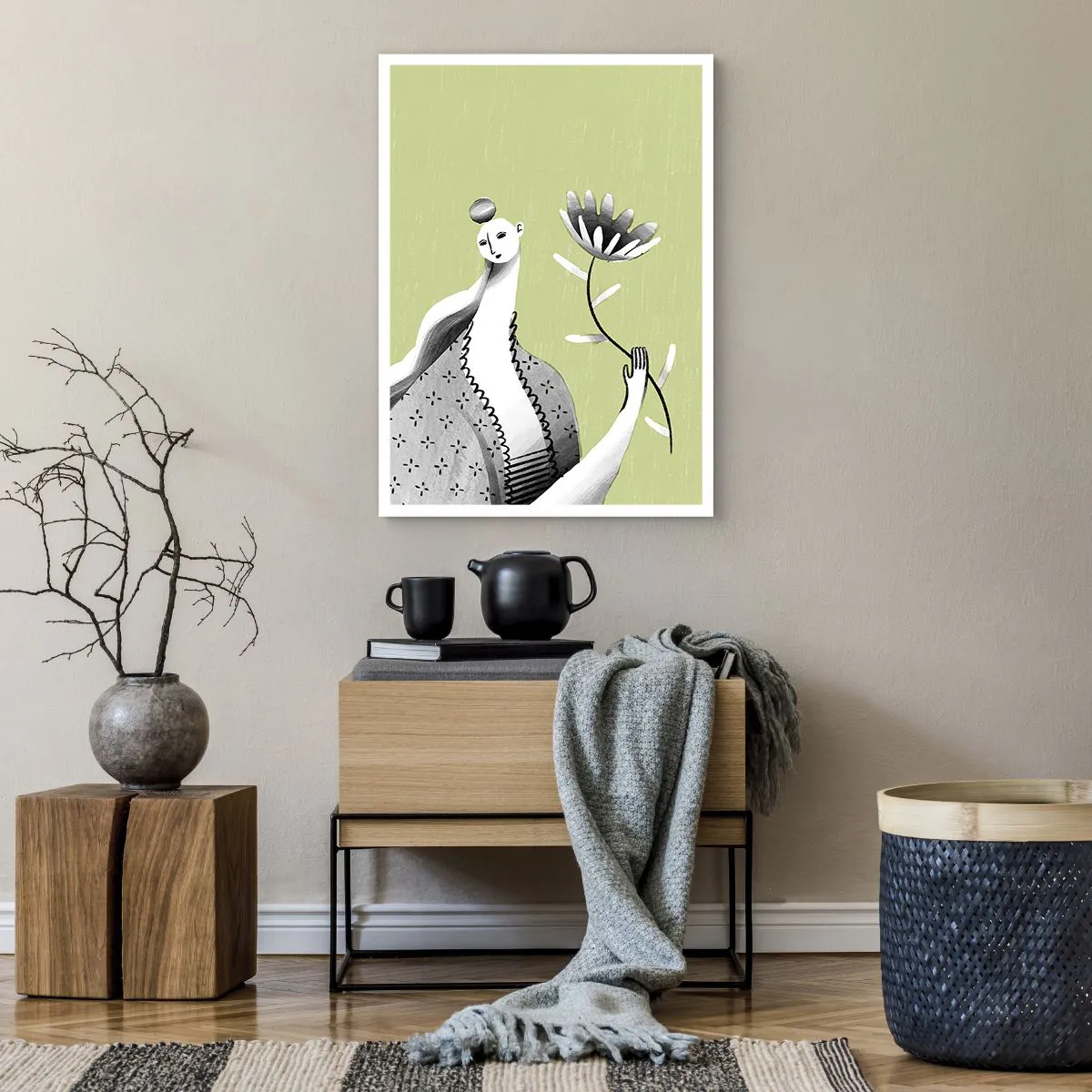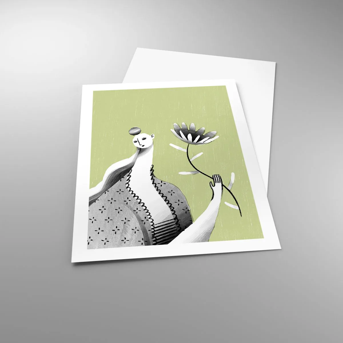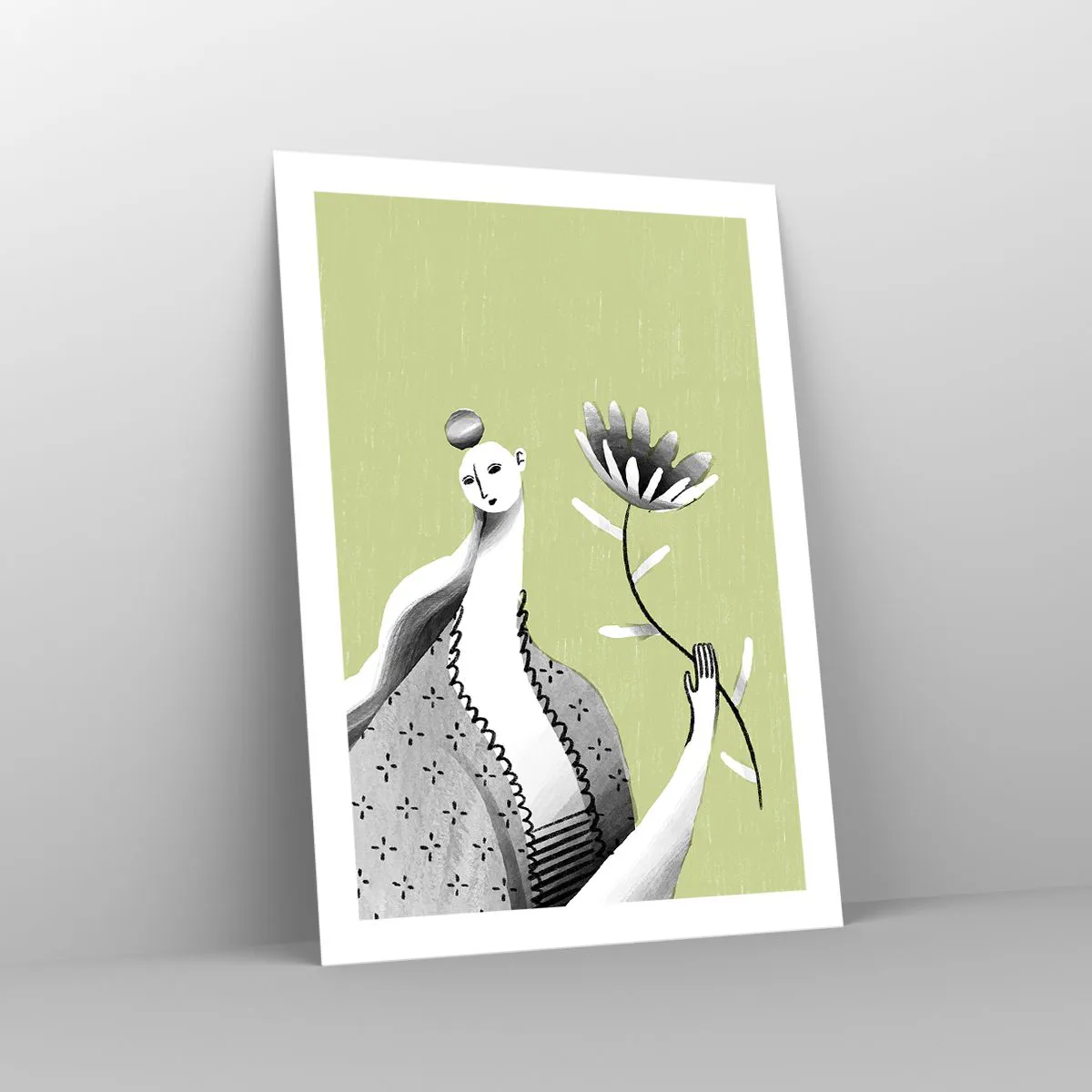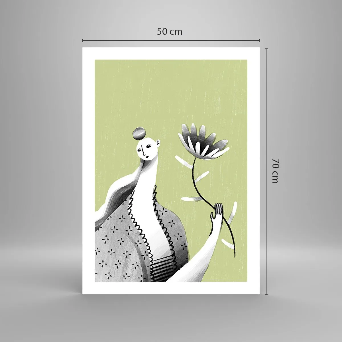 Poster - Minimalistische Frau hält eine Blume auf grünem Hintergrund - 50x70cm - Modernistisches Porträt – eine Blume haltend - Moderne Wanddekoration für Wohnzimmer und Schlafzimmer ARTTOR