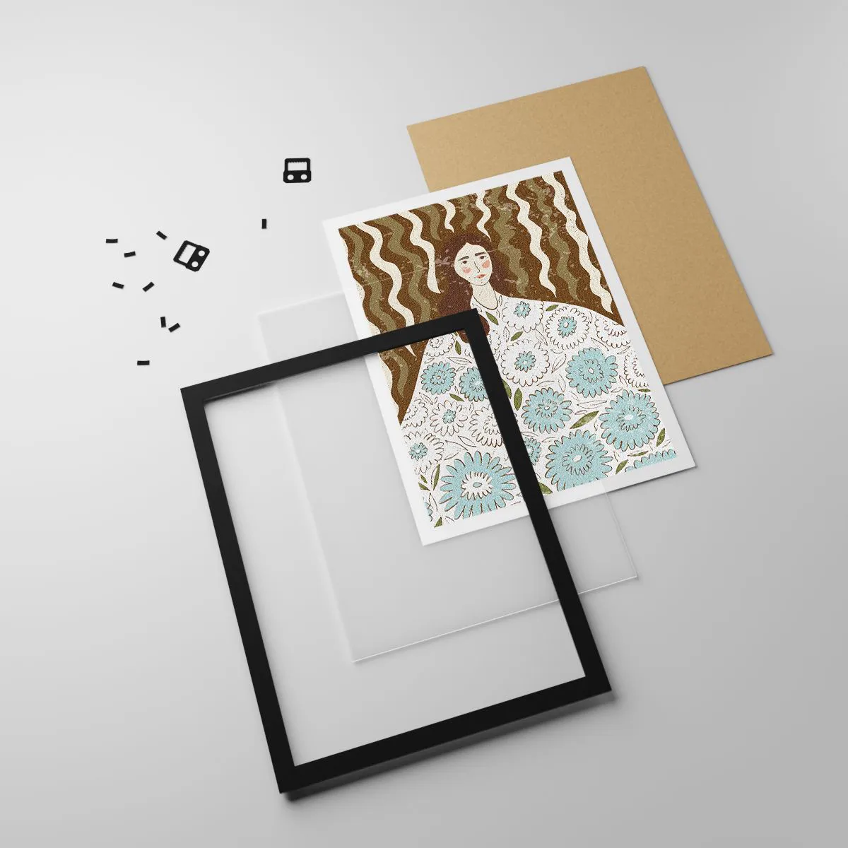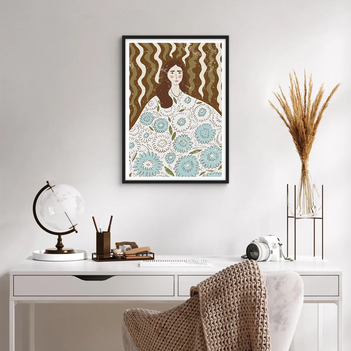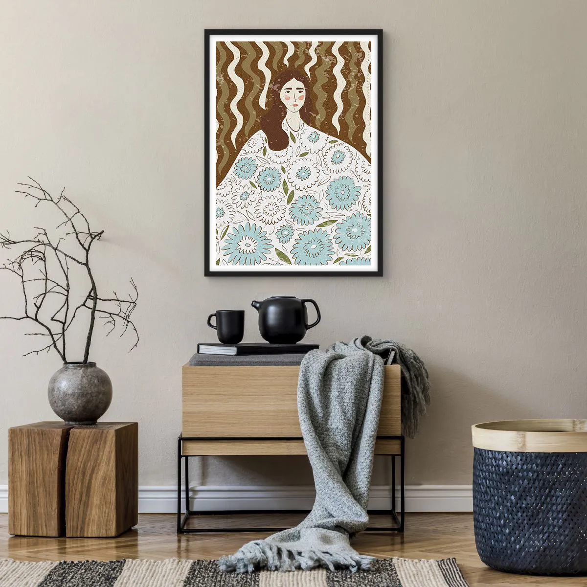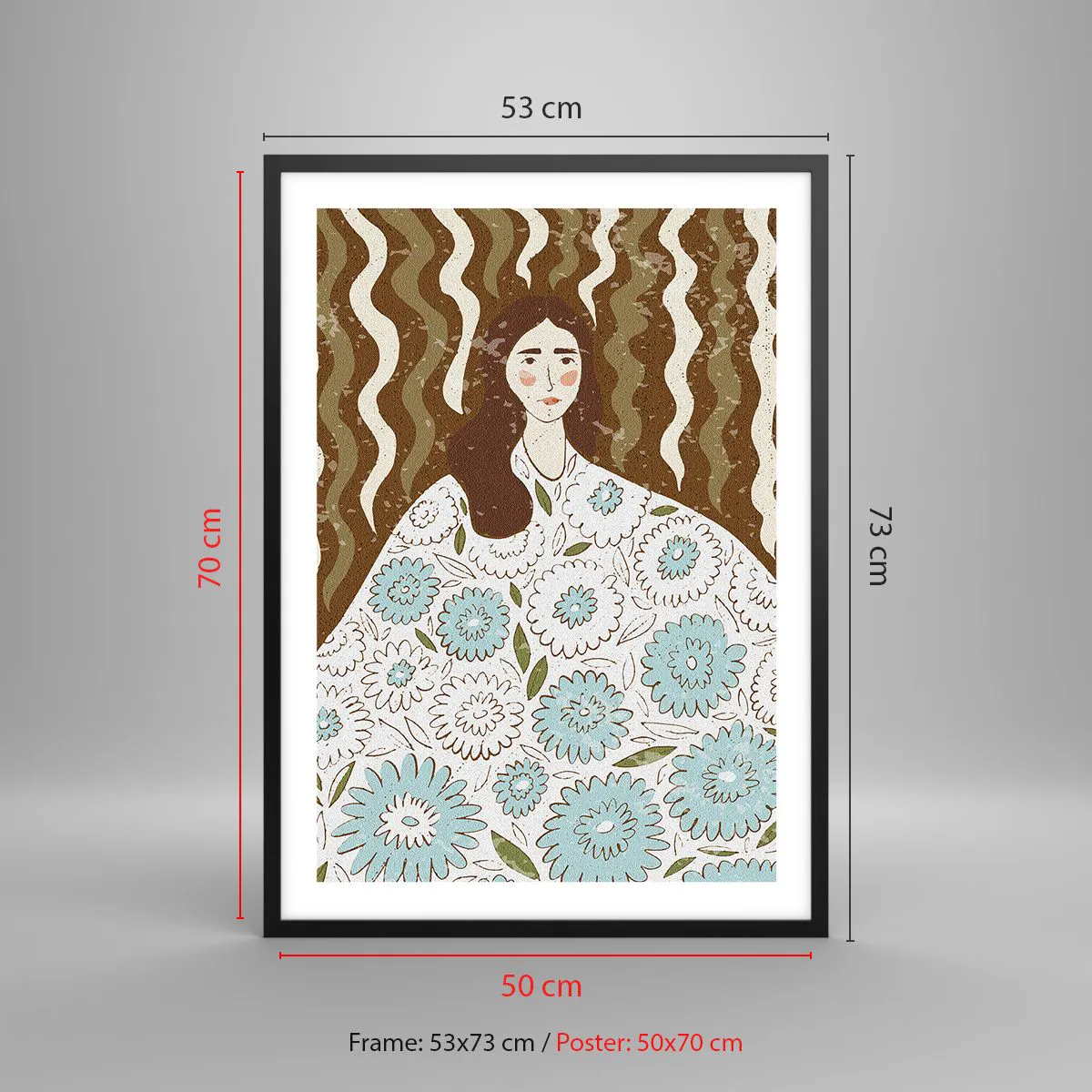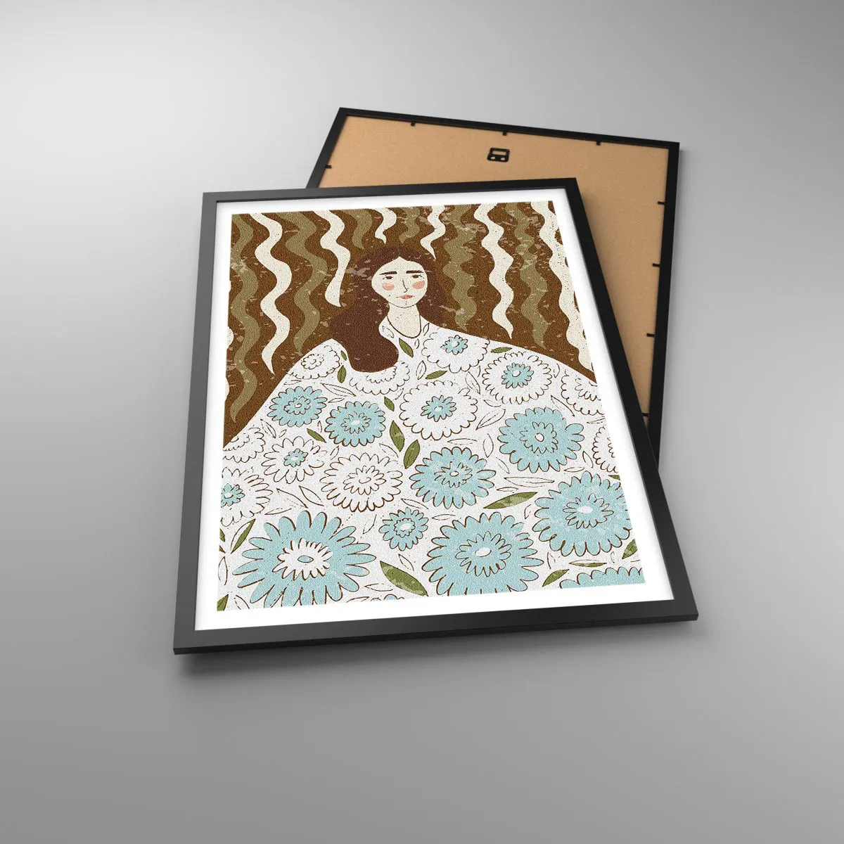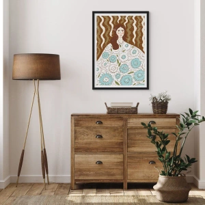Poster in einem schwarzem Rahmen - Stilisiertes Porträt einer Frau in einem geblümten Kleid vor einem Hintergrund aus Wellenmustern. - 50x70cm - Porträt im floralen Gewand - Moderne Wanddekoration für Wohnzimmer und Schlafzimmer ARTTOR