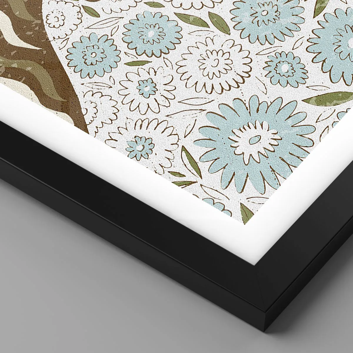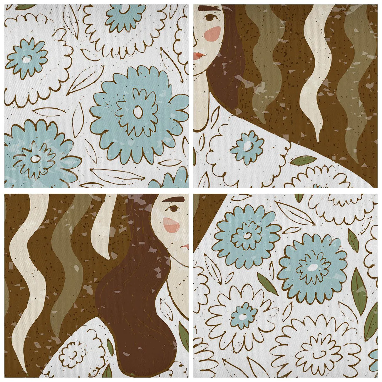 „Porträt im Blumengewand“ ist ein außergewöhnliches Poster, das ein Porträt einer Frau in einem einzigartigen Stil zeigt. Ihr langes Kleid ist mit einem Blumenmuster in zarten Blau- und Beigetönen verziert, das einen Kontrast zum braunen, mit Wellenlinien verzierten Hintergrund bildet. Dieses Werk kombiniert Elemente der Retro-Kunst und moderner Illustration und schafft so eine harmonische und faszinierende Komposition.