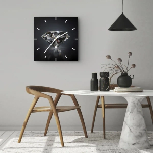 Die Uhr besteht aus 4 mm dickem Sicherheitsglas Glas. Die Herstellungstechnologie der Uhr entspricht der Sicherheitsklasse 2B2 gemäß der Norm PN-EN 12600: 2004, die Stoßfestigkeit garantiert. Die Uhr auf dem Glas ist bereit zu hängen - es hat einen Metallanhänger, einen Anhänger auf der Rückseite der Uhr und einen Schaumstoffabstand, der einen gleichmäßigen Abstand zwischen der Uhr und der Wand reguliert. Die Uhr hat einen geräuschlosen Schwimmmechanismus, der von einer 1,5-V-Batterie betrieben wird - AA-Batterie inbegriffen).
