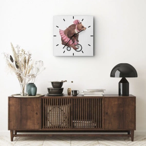 Die Uhr besteht aus 4 mm dickem Sicherheitsglas Glas. Die Herstellungstechnologie der Uhr entspricht der Sicherheitsklasse 2B2 gemäß der Norm PN-EN 12600: 2004, die Stoßfestigkeit garantiert. Die Uhr auf dem Glas ist bereit zu hängen - es hat einen Metallanhänger, einen Anhänger auf der Rückseite der Uhr und einen Schaumstoffabstand, der einen gleichmäßigen Abstand zwischen der Uhr und der Wand reguliert. Die Uhr hat einen geräuschlosen Schwimmmechanismus, der von einer 1,5-V-Batterie betrieben wird - AA-Batterie inbegriffen).