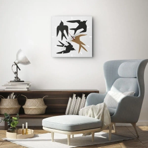 Wanduhr - Glasuhr - Schwarz-goldene Silhouetten von Schwalben auf weißem Hintergrund - 30x30cm - Schwalbenspaß - Moderne Wanddekoration für Wohnzimmer, Küche und Schlafzimmer ARTTOR