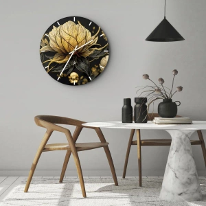 Wanduhr - Glasuhr - Gold und schwarze Blume auf dunklem Hintergrund - 30x30cm - Subtile Zerbrechlichkeit - Moderne Wanddekoration für Wohnzimmer, Küche und Schlafzimmer ARTTOR