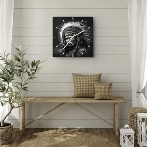 - Eine Wanduhr mit dem Schwarz-Weiß-Porträt eines Häuptlings mit traditionellem Federkopfschmuck. Eine eindrucksvolle Komposition mit symbolischem und kriegerischem künstlerischem Charakter.