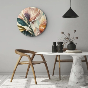 - Diese 30 x 30 cm große Wanduhr aus Glas zeigt eine Komposition aus leuchtenden tropischen Blumen. Eine malerische Dekoration mit exotischem Flair, die Wärme, Natur und Kunst vereint.