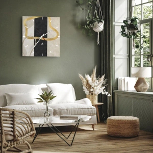 - Diese 30x30 cm große Glaswanduhr besticht durch eine moderne Komposition aus goldenen Linien auf schwarzem Hintergrund und beigen Flächen. Eine dekorative Abstraktion im minimalistischen Stil.