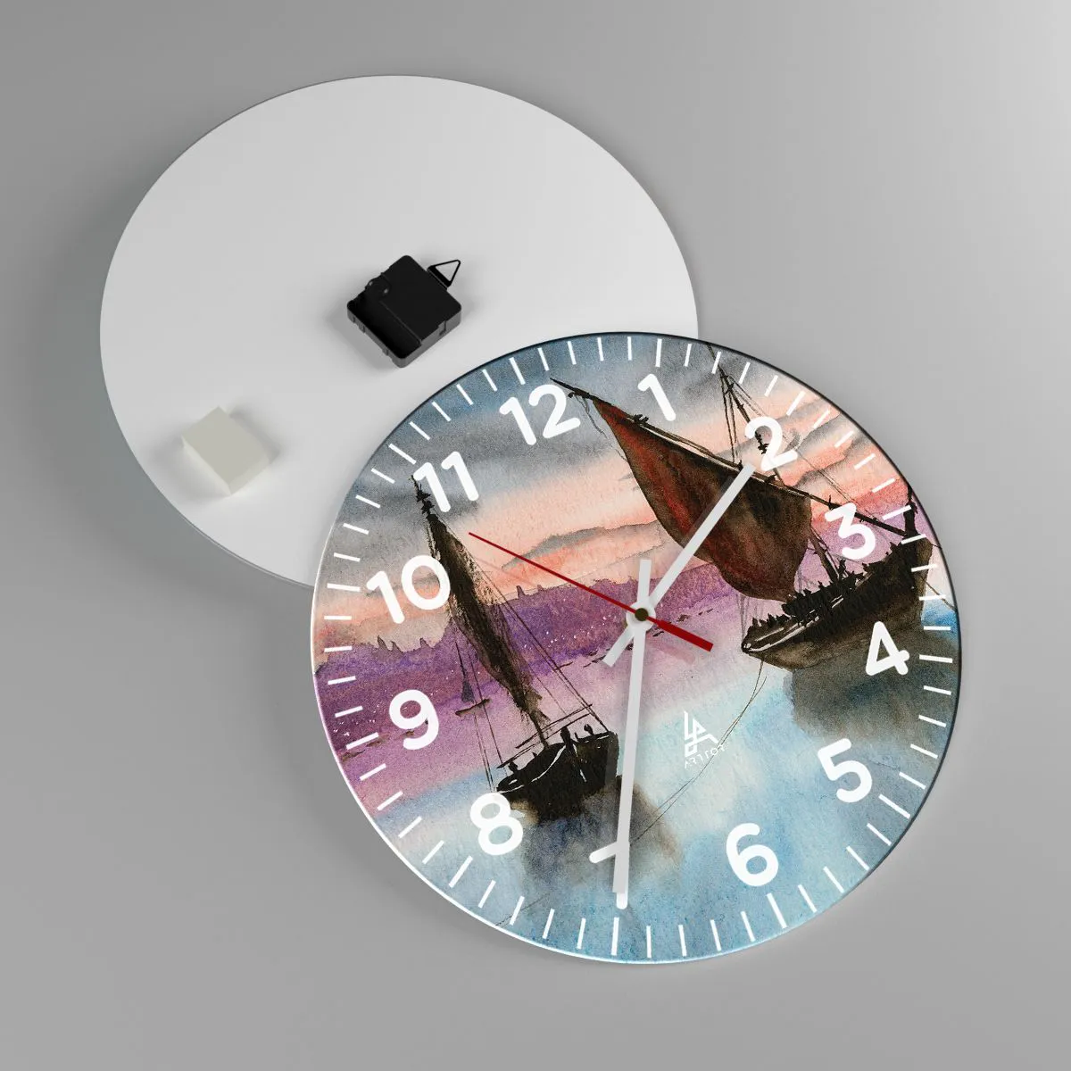 Die Uhr besteht aus 4 mm dickem Sicherheitsglas Glas. Die Herstellungstechnologie der Uhr entspricht der Sicherheitsklasse 2B2 gemäß der Norm PN-EN 12600: 2004, die Stoßfestigkeit garantiert. Die Uhr auf dem Glas ist bereit zu hängen - es hat einen Metallanhänger, einen Anhänger auf der Rückseite der Uhr und einen Schaumstoffabstand, der einen gleichmäßigen Abstand zwischen der Uhr und der Wand reguliert. Die Uhr hat einen geräuschlosen Schwimmmechanismus, der von einer 1,5-V-Batterie betrieben wird - AA-Batterie inbegriffen).