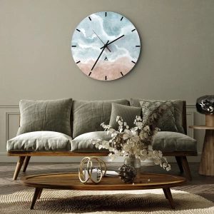 - Diese Wanduhr zeigt eine pastellfarbene Abstraktion, die an Himmel und Meeressand erinnert. In zarten Blau- und Beigetönen gehalten, bringt sie Harmonie und eine subtile künstlerische Note in jedes Interieur.