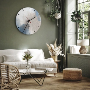 Die Wanduhr „Rosa Abstraktion hinter einem Schleier aus Blau“ ist eine poetische und dezente Komposition, die durch ihre Zartheit und subtilen Kontraste die Aufmerksamkeit auf sich zieht. Die dominierenden Farben sind hier Blau, Beige, Grau und im Hintergrund versteckte Spuren von Rosa, wodurch ein Bild voller Abstraktion entsteht.