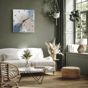 Wanduhr - Glasuhr - Moderne Abstraktion in Beige, Blau und Grau - 30x30cm - Rosa Abstraktion hinter einem blauen Vorhang - Moderne Wanddekoration für Wohnzimmer, Küche und Schlafzimmer ARTTOR