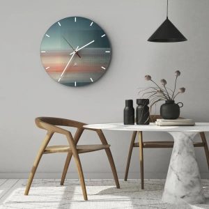 „Abstraktion: Lichtwellen“ ist eine moderne Wanduhr mit einer außergewöhnlich ruhigen und subtilen Ästhetik. Das Zifferblatt zeigt ein abstraktes Motiv, das an Lichtwellen erinnert – verschwommene Farbbänder erzeugen den Effekt eines harmonischen Übergangs.