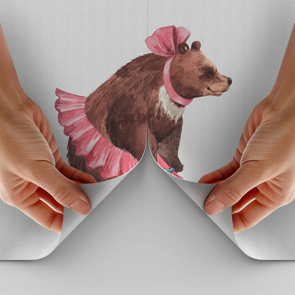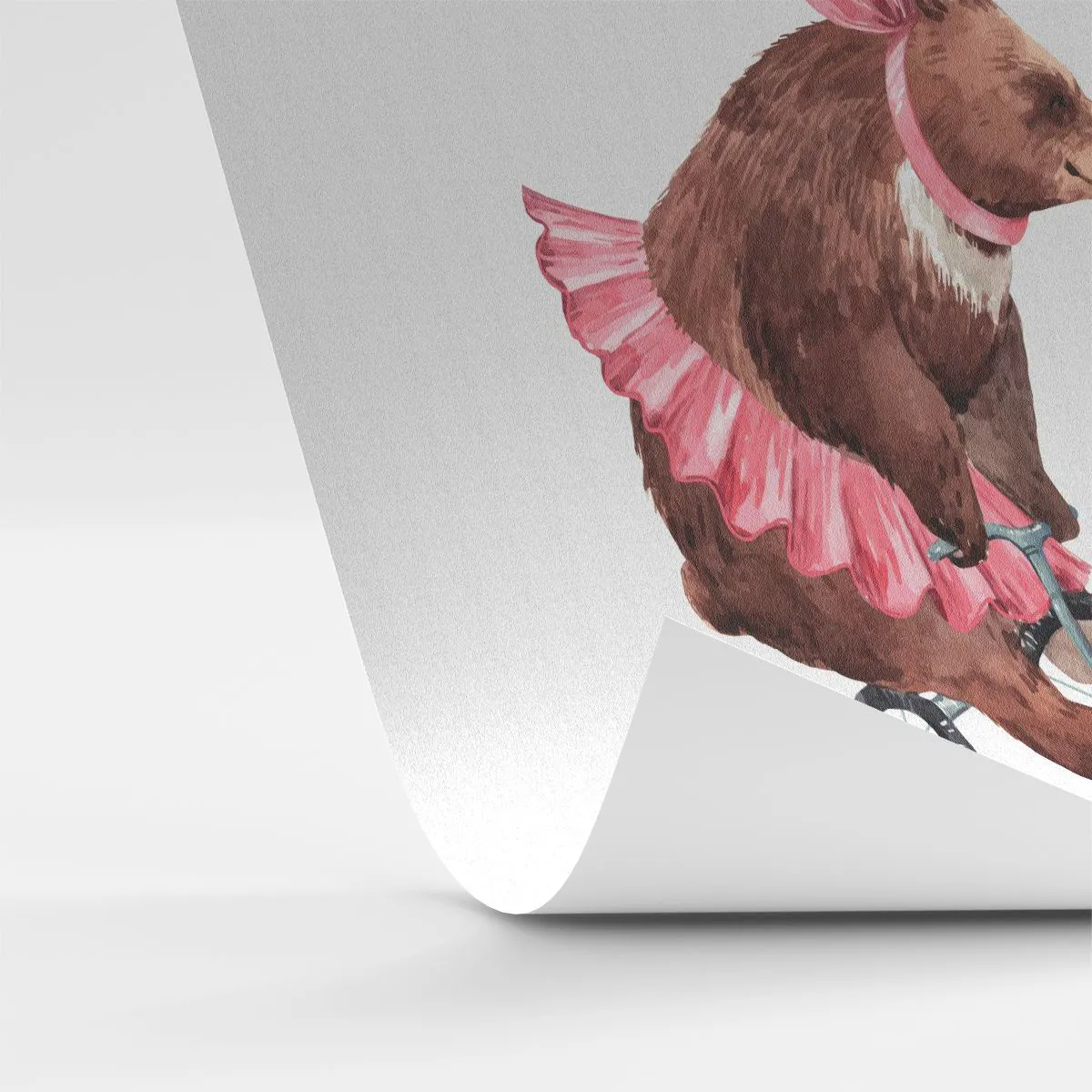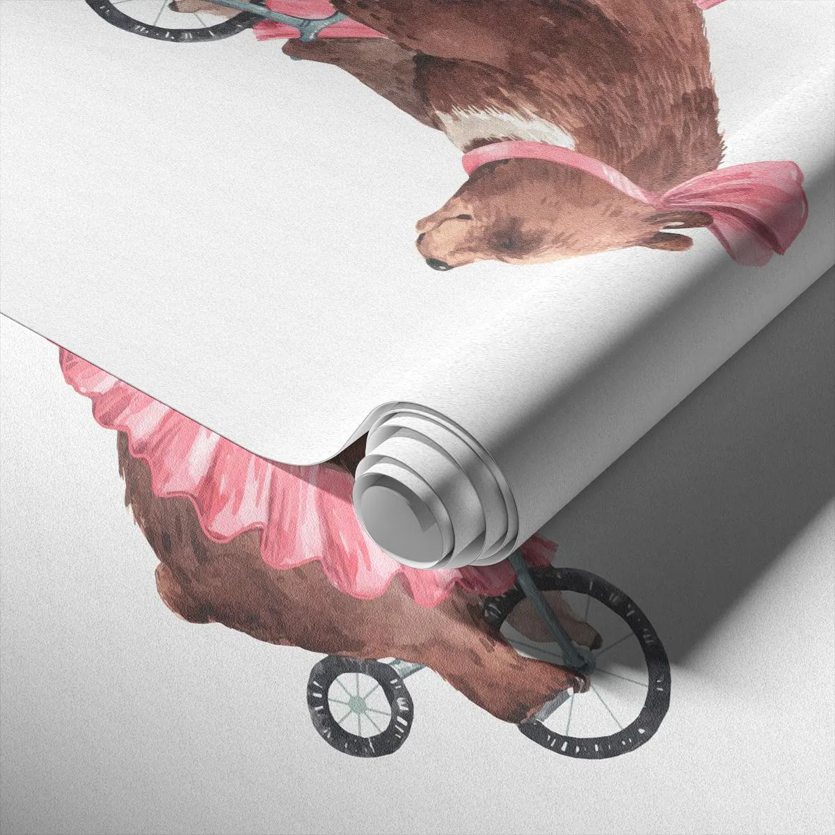 - Eine verspielte Illustration eines Teddybären in einem rosa Rock, der Fahrrad fährt. Die pastellfarbene Grafik verschönert und dekoriert jedes Kinderzimmer.