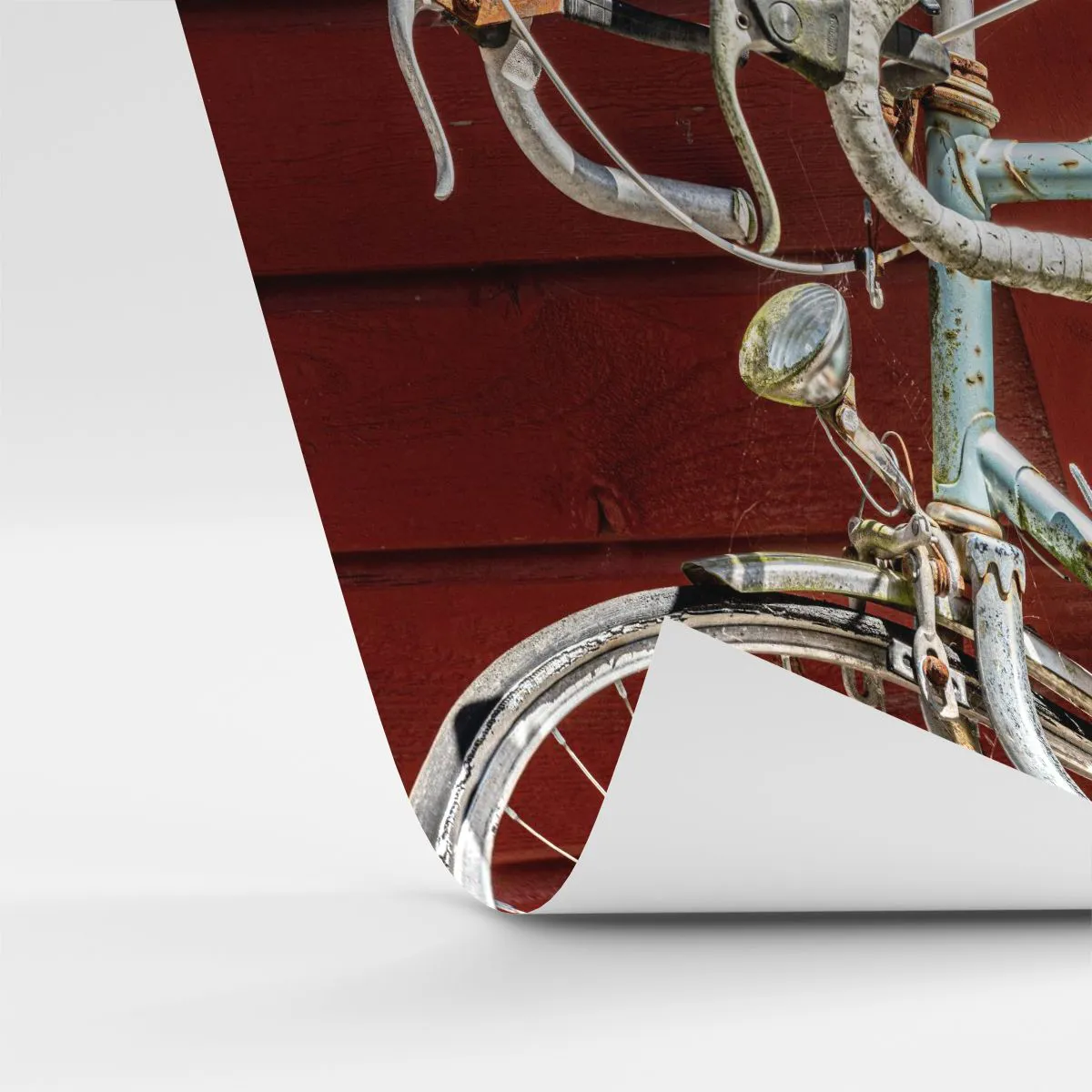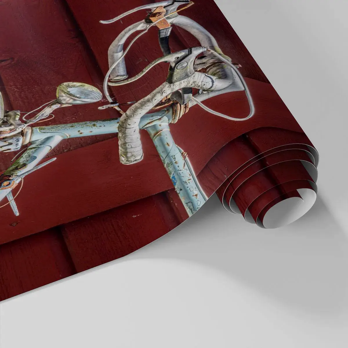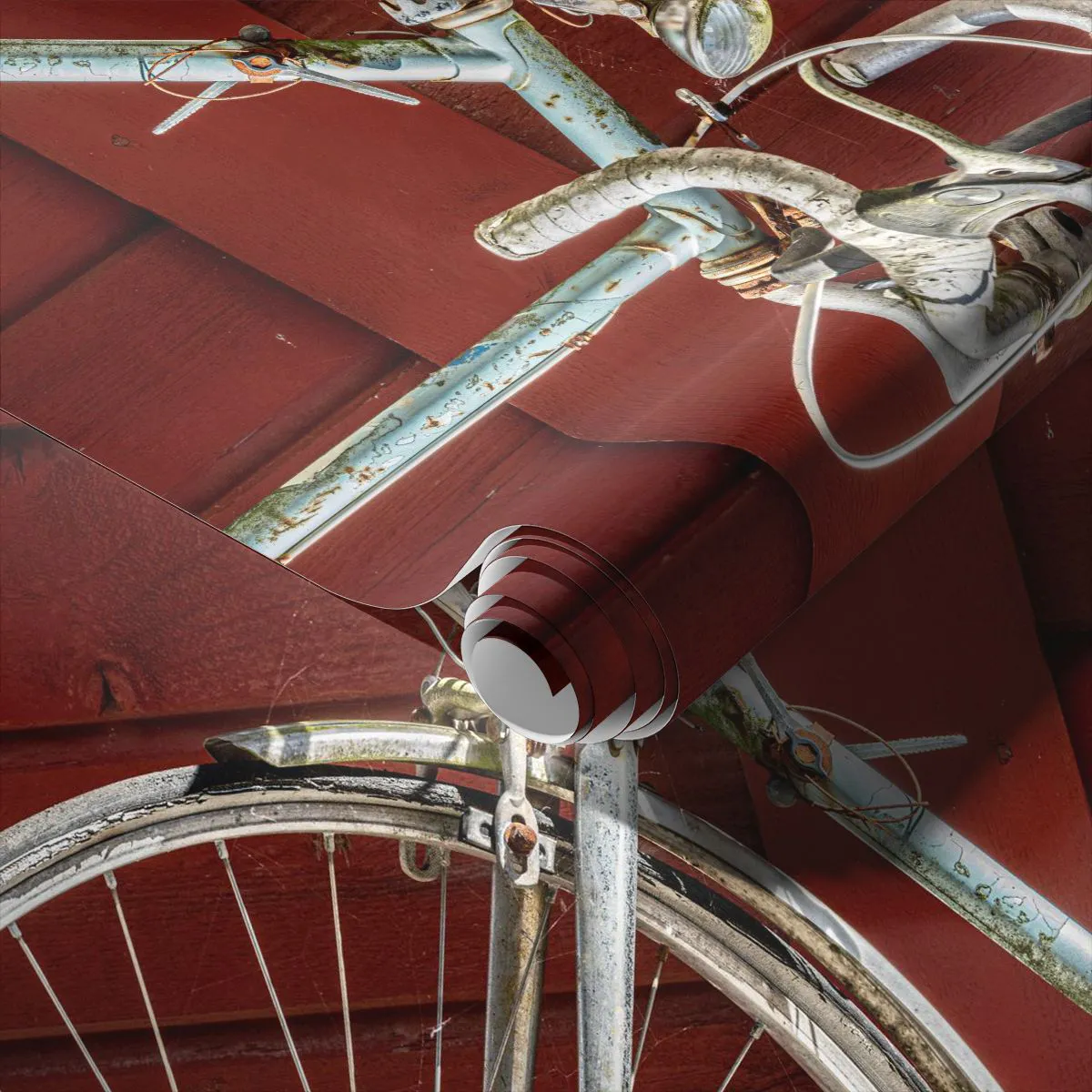 - Diese Fototapete zeigt die Nahaufnahme eines alten Rennrads mit blauem Rahmen, fotografiert vor einer roten Holzwand. Eine detailreiche Komposition mit Retro-Flair, perfekt für Interieurs mit Seele.