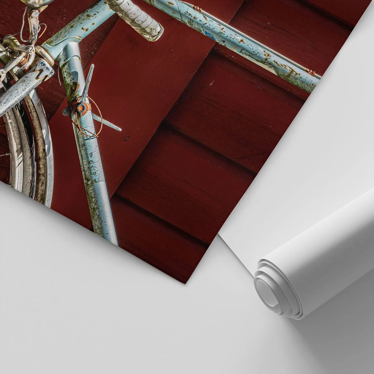 Details wie abgenutzte Lenkergriffe, Rost am Rahmen und ein Fahrradreflektor verleihen Authentizität und machen das Bild nicht nur zu einer Dekoration, sondern auch zu einer Geschichte von Geschichte, Anstrengung und Siegen – sowohl im Sport als auch im Alltag. Es ist ein perfektes Motiv für Innenräume, die vom Vintage-, Industrie- oder Loft-Stil inspiriert sind.