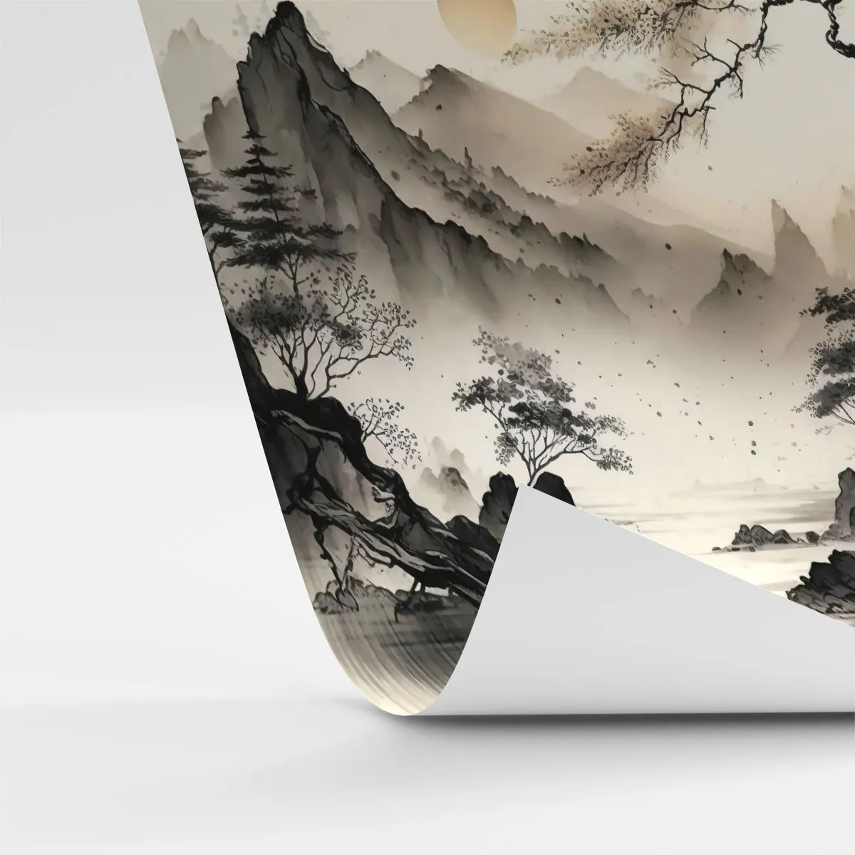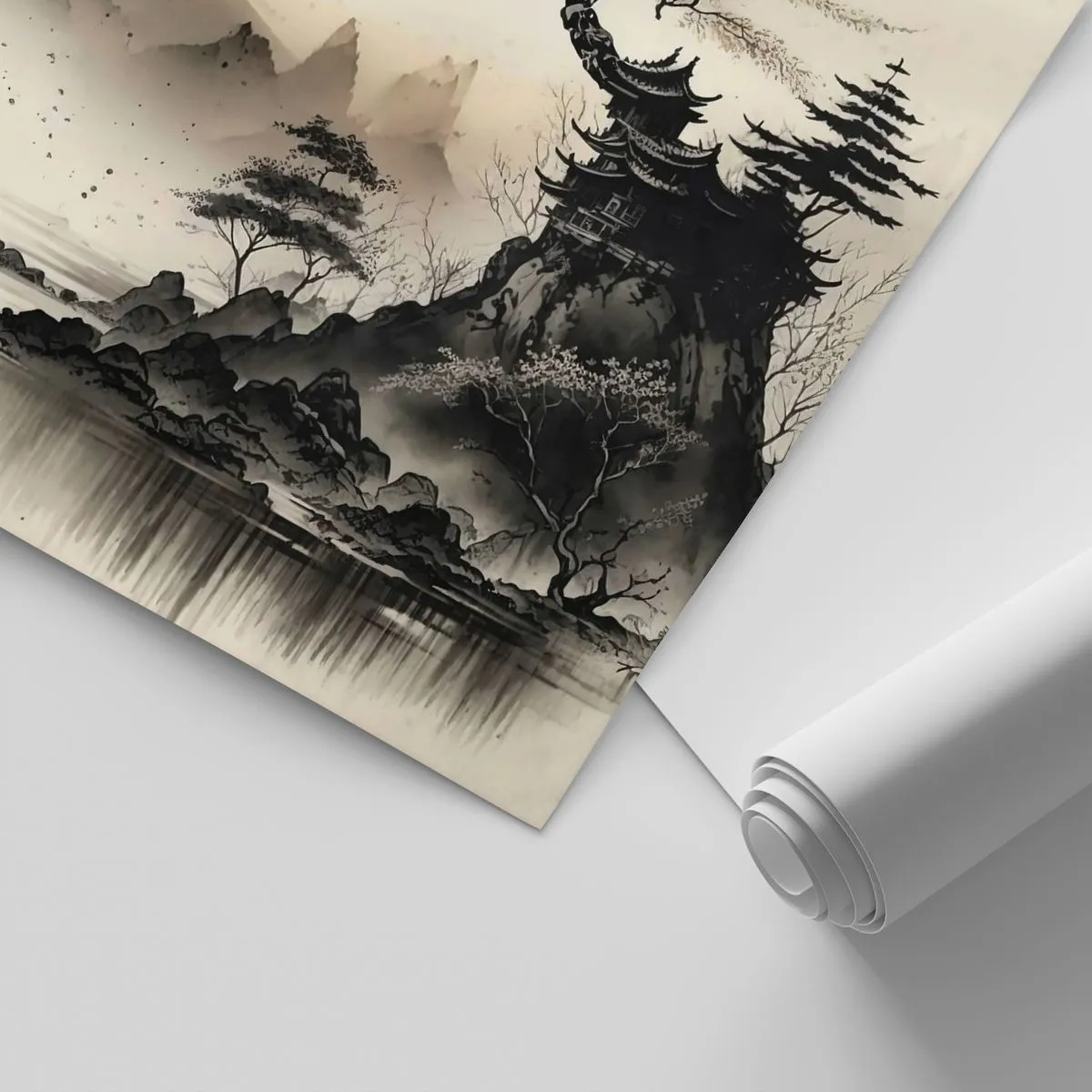 - Eine schwarz-weiße orientalische Berglandschaft mit Wasser und einem Tempel auf dem Gipfel. Der künstlerische Tuschestil, inspiriert von der traditionellen östlichen Malerei, bringt Ruhe, Eleganz und einen Hauch meditativer Besinnung in das Interieur.