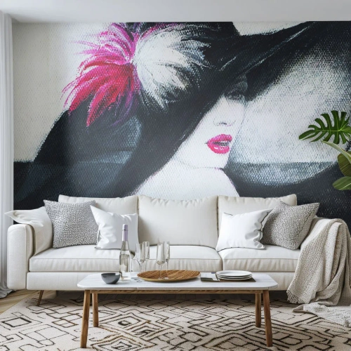 Fototapete Premium Sand - Immer ein Geheimnis - Frau, In, A, Hat, Das Gesicht einer Frau, rote Lippen - 500x350 cm