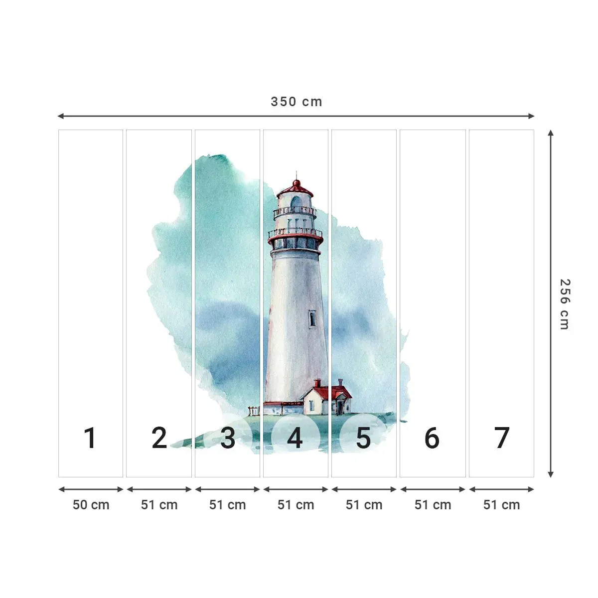 Selbstklebende Fototapete Deluxe Sticker - Sanfte Schwester vom Blau - Leuchtturm, Strand, Zeichnung - 350x256 cm