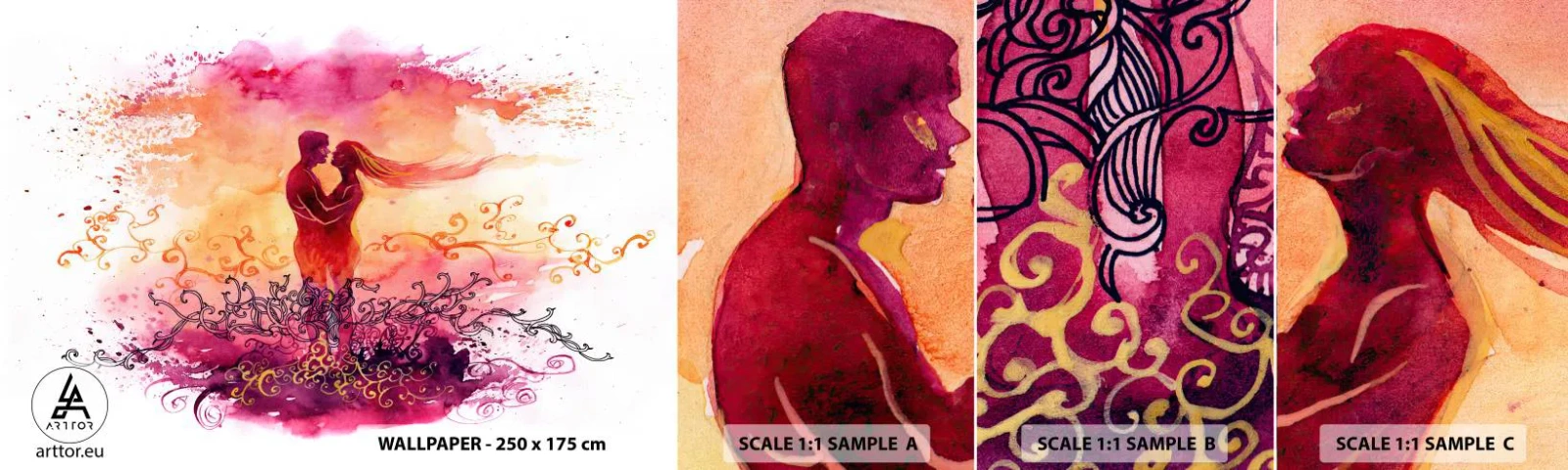 Die matte Textur der Fototapete minimiert Lichtreflexionen und kaschiert so kleine Wandunebenheiten. Moderne Drucktechnologie sorgt für natürlich gesättigte Farben, die dem Innenraum einen einzigartigen Charakter verleihen. Mit dem Muster können Sie das Aussehen des Materials auf einer größeren Fläche beurteilen, bevor Sie eine endgültige Kaufentscheidung treffen.