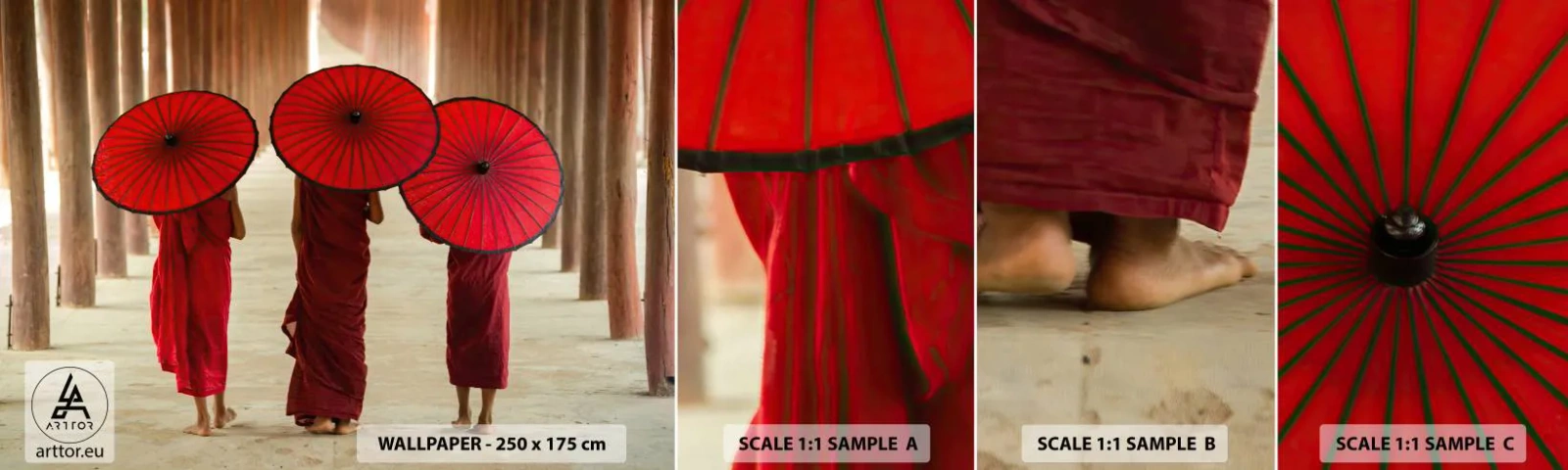 Die matte Textur der Fototapete minimiert Lichtreflexionen und kaschiert so kleine Wandunebenheiten. Moderne Drucktechnologie sorgt für natürlich gesättigte Farben, die dem Innenraum einen einzigartigen Charakter verleihen. Mit dem Muster können Sie das Aussehen des Materials auf einer größeren Fläche beurteilen, bevor Sie eine endgültige Kaufentscheidung treffen.