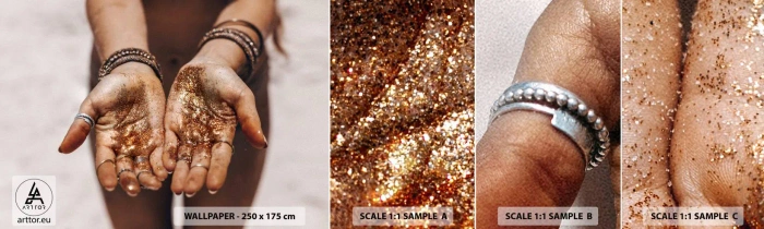 Fototapetenmuster Standard Eco - Ein Geschenk für dich - Frauenhände, Boho, Gold - 100x30 cm