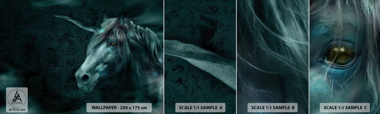 Fototapeten Muster Premium Sand - In einem Märchenwald - Einhorn, Fantasie, Abstraktion - 100x30 cm