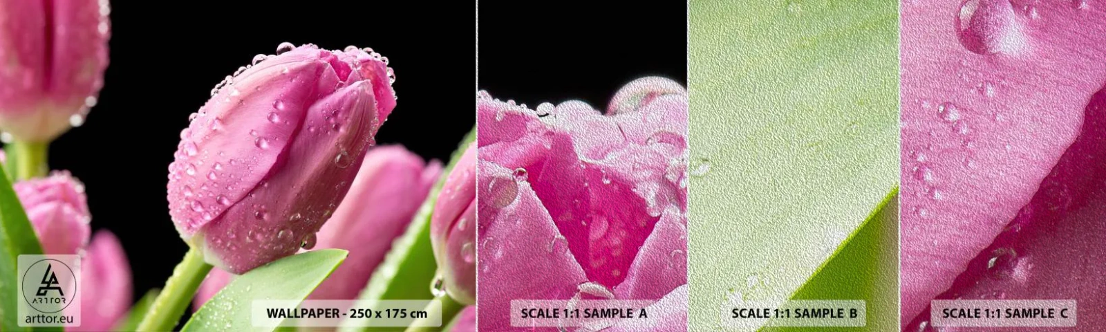 Fototapeten Muster Premium Sand - Lila Traum im Tau - Blumen, Tulpen, Blumenstrauß - 100x30 cm
