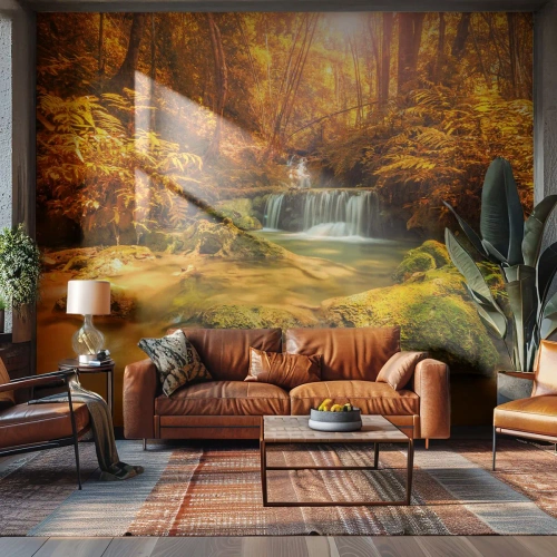 Fototapete Premium Canvas - Waldkaskade in Gold - Landschaft, Wasserfall, Thailand - 150x105 cm