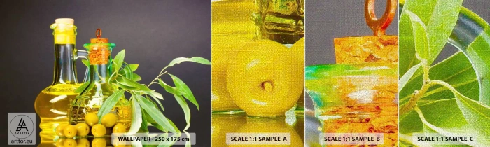 Fototapeten Muster Premium Canvas - Stillleben mit Oliven und Olivenöl - Gastronomie, Oliven, Öl - 100x30 cm