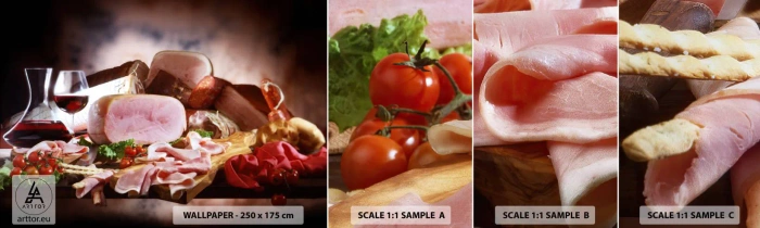 Fototapeten Muster Selbstklebend Deluxe Sticker - Ein kulinarischer Traum mit einer Karaffe - Gastronomie, Fleisch, Tomaten - 100x30 cm