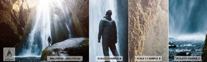 Fototapeten Muster Selbstklebend Deluxe Sticker - Wiederherstellung der Proportionen - Wasserfall, Felsen, Höhle - 100x30 cm