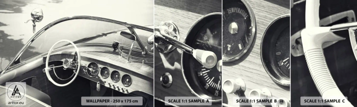 Fototapeten Muster Selbstklebend Deluxe Sticker - Wetter für die Reichen - Vintage-Boot, Motorboot, Schwarz und weiß - 100x30 cm