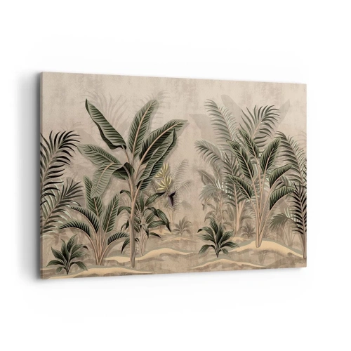 Bild auf Leinwand - Leinwandbild - Palmen und tropische Vegetation in Grüntönen auf beigem Hintergrund - 120x80cm - Eine Gravur im Kolonialstil - Moderne Wanddekoration für Wohnzimmer und Schlafzimmer ARTTOR