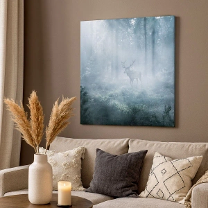 - Dieser 70x50 cm große Leinwanddruck zeigt ein Reh in einem dichten, in Morgennebel gehüllten Wald. Eine perfekte Dekoration für Liebhaber der Natur und geheimnisvoller Landschaften.