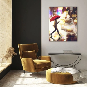 Glasbild - Bild auf glas - Eine Figur mit einem roten Regenschirm auf einer verregneten Straße in der Nacht - 120x80cm - Und doch sonnig - Moderne Wanddekoration für Wohnzimmer und Schlafzimmer ARTTOR