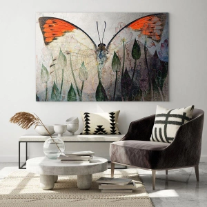 Das Gemälde mit einem Schmetterling und Blumen ist ein Vorschlag für alle, die von der Natur inspirierte Kunst und Dekorationen mit subtilem und romantischem Charakter schätzen. Es ist eine ausgezeichnete Wahl für alle, die Elemente natürlicher Schönheit und Harmonie in ihr Interieur bringen möchten.