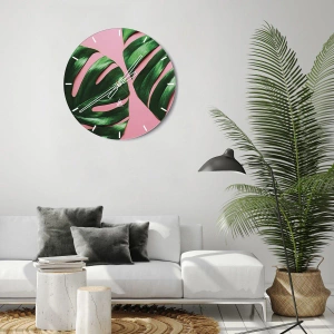 Wanduhr - Glasuhr - Grüne Monstera-Blätter auf rosa Hintergrund - 30x30cm - Rendezvous im Grünen - Moderne Wanddekoration für Wohnzimmer und Schlafzimmer ARTTOR