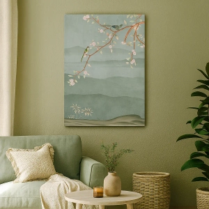 Dieses Motiv eignet sich perfekt für Räume wie Wohnzimmer, Schlafzimmer oder Ruhebereiche und setzt einen natürlichen Akzent. Das Gemälde fügt sich harmonisch in eine Vielzahl von Einrichtungsstilen ein, von klassisch bis Boho, und verleiht dem Interieur Wärme und Subtilität. Ein blühender Ast mit Vögeln symbolisiert Wiedergeburt, Frieden und Naturverbundenheit.