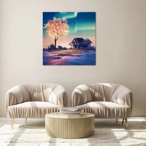 Glasbild - Bild auf glas - Eine zauberhafte Landschaft mit einem blühenden Baum und einem Häuschen - 50x70cm - Die Natur vergeht nicht - Moderne Wanddekoration für Wohnzimmer und Schlafzimmer ARTTOR