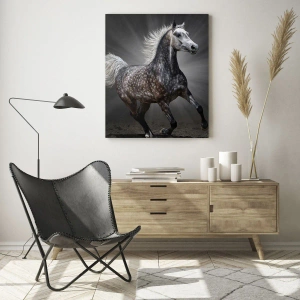 Glasbild - Bild auf glas - Ein galoppierendes Pferd vor dunklem Hintergrund mit Lichteffekt. - 70x50cm - Grau ist schön - Moderne Wanddekoration für Wohnzimmer und Schlafzimmer ARTTOR