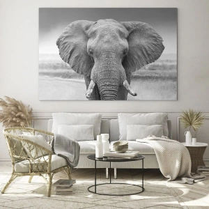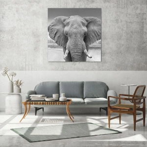 Glasbild - Bild auf glas - Schwarz-Weiß-Porträt eines Elefanten in der Savanne - 50x70cm - Willkommen in meiner Welt - Moderne Wanddekoration für Wohnzimmer und Schlafzimmer ARTTOR